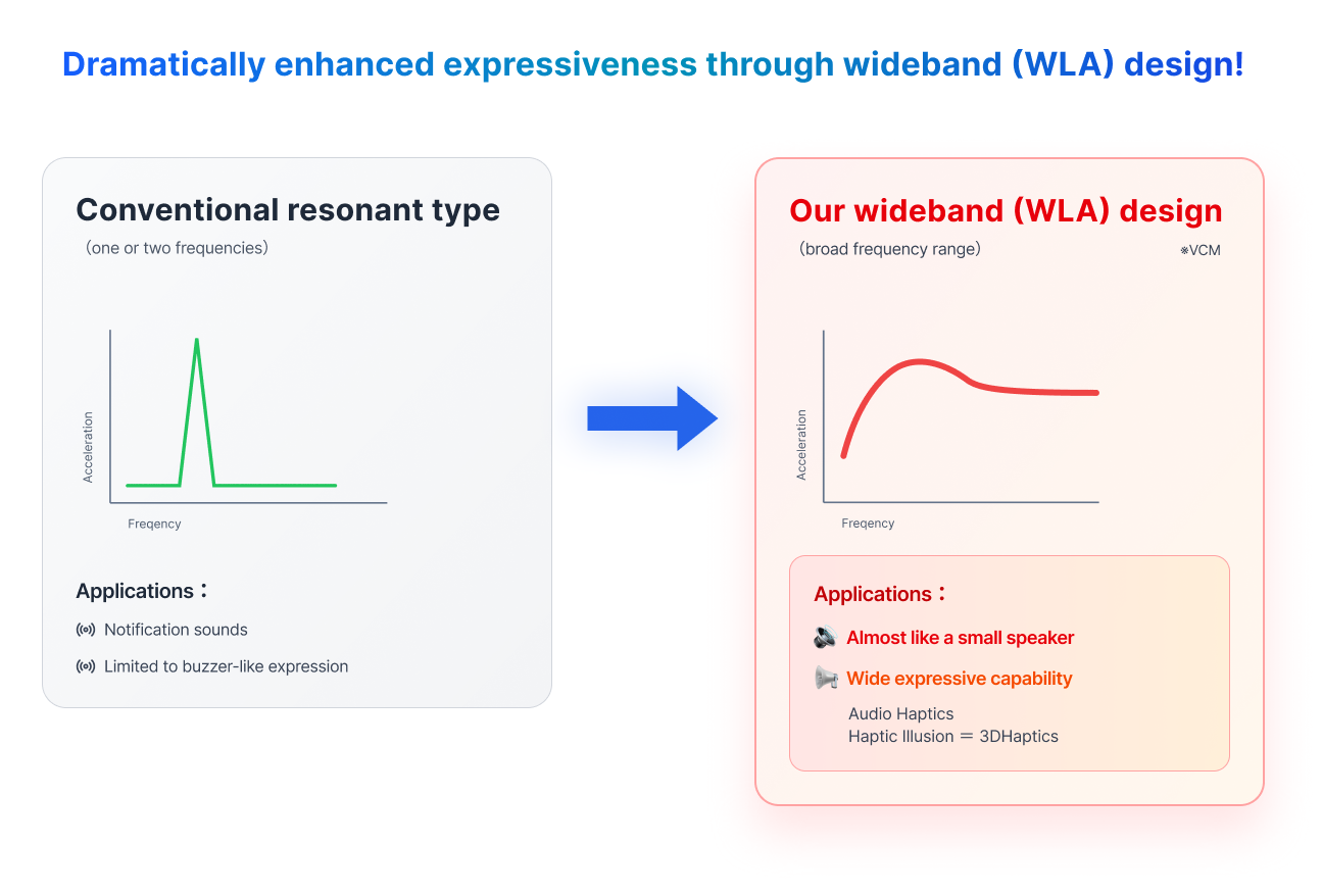 With its wideband frequency design, the actuator delivers a broad range of haptic expressions.